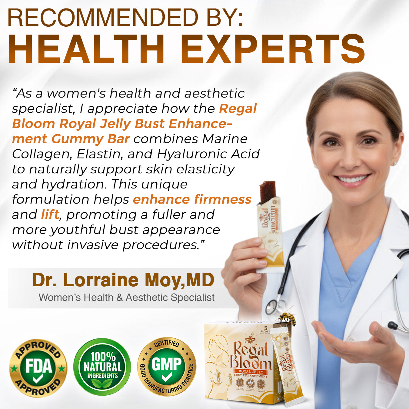 "Before Regal Bloom, I was considering surgery because my breasts had started sagging after two pregnancies. Then a friend recommended these Royal Jelly Gummy Bars, and I decided to give them a try. Within a month, I could see a lift and feel my skin becoming firmer and more elastic. Itโs amazing how something so easy and tasty could bring back my confidence!" โ Lauren Stevens, 35 years old, Dallas, USA